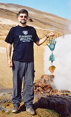 Brad, standing before an active Icelandic geyser, shares the melodic magic of our Friendship Bell, creating a harmonious symphony amidst the geothermal wonders of this extraordinary land.
